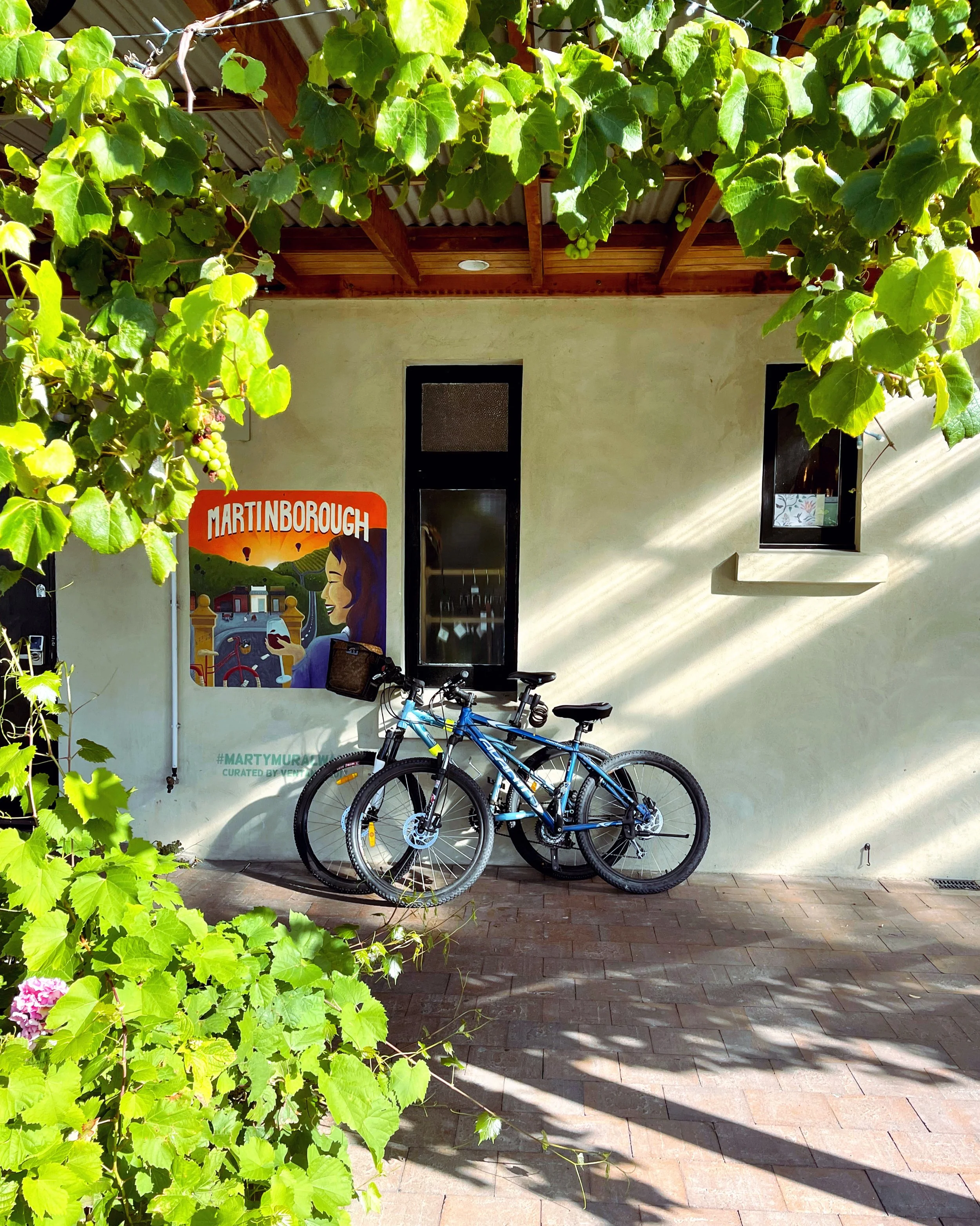 Two bicycles leaning against a wall in Martinborough ready to be taken out among the vineyards